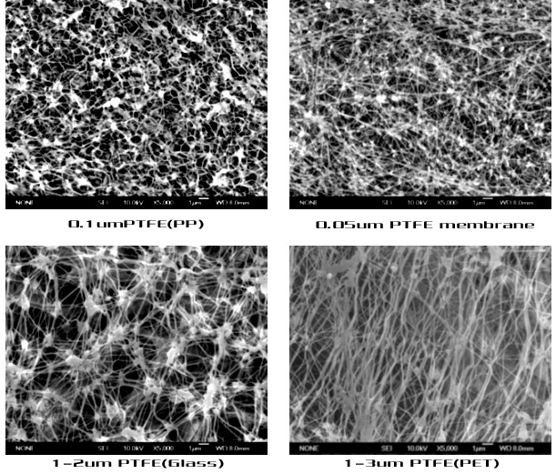 PTFE membrane is a layer of PTFE material that removes particles of a certain size and shape, while allowing others to pass through. When applied to a substrate (such as fiberglass, P90, etc.) it removes particles much like dustcake normally would on a Baghouse filter. * See section “The Benefits of Surface Filtration”